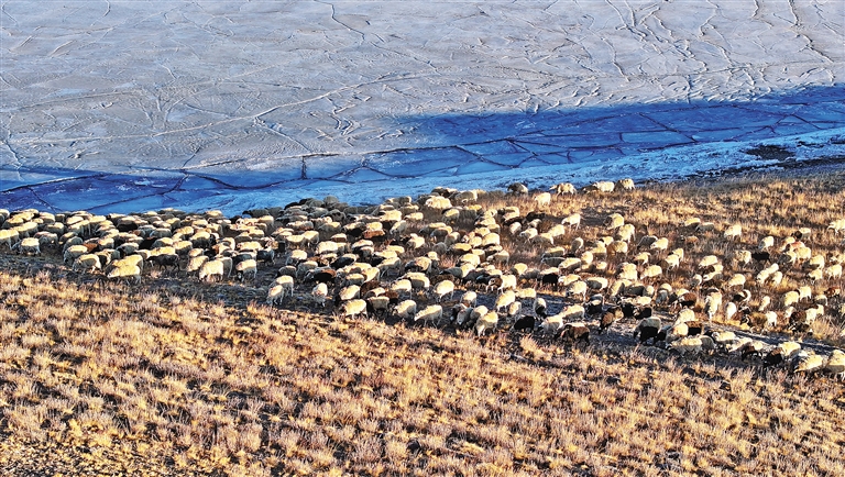 當(dāng)羊群踏上湖心島的那一刻,仿佛整個世界都安靜了下來。羊群悠閑地吃著草,享受著冬日的陽光。