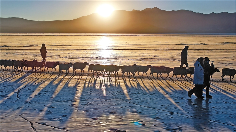 朝陽下,羊群在牧民和民警的保護下前往湖心島牧場。(圖片均由記者 旦增蘭澤 平措次仁 晉巴次成 武沛濤 攝)
