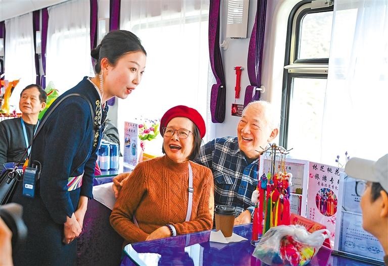 3月26日,入藏旅游專列列車員在為旅客介紹非遺產(chǎn)品。新華社記者 齊芷玥 攝