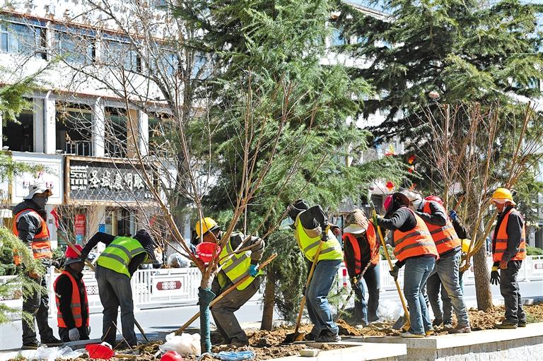 圖為養(yǎng)護(hù)工人在種樹。記者 洛桑 攝