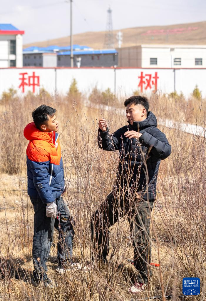 4月25日,那曲市林業(yè)和草原局工作人員在檢查前幾年種植的樹木長勢。新華社記者 晉美多吉 攝