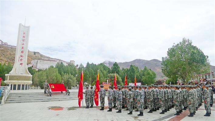 圖為駐藏某汽車團野外駐訓(xùn)分隊在江孜宗山英雄紀(jì)念碑前開展主題黨課活動。加央群決 李豪 攝