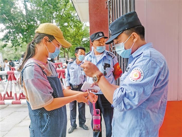 圖為在拉薩中學(xué)考點門口,工作人員對即將進(jìn)入考點熟悉環(huán)境的考生進(jìn)行體溫檢測和身份驗證。記者 王莉 攝