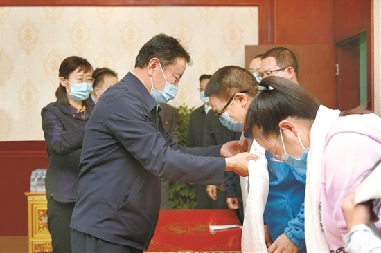 9月10日上午,區(qū)黨委常委、拉薩市委書記白瑪旺堆看望慰問離退休和辛勤工作在教育一線的教師代表,并通過他們向全市廣大教師和教育工作者致以節(jié)日的祝賀和誠摯的問候。圖為在拉薩市北京中學(xué),白瑪旺堆為教師代表一一獻上哈達。 拉薩融媒記者 平措旺堆攝