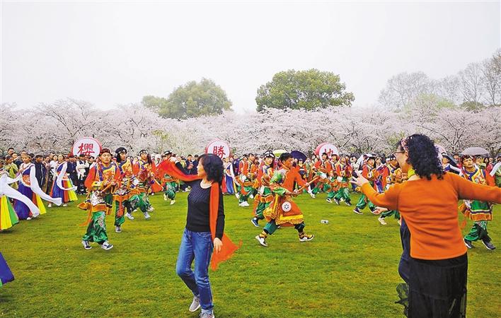 圖為在武漢西藏中學(xué)舉行的東湖櫻園綠色行活動中,各族師生翩翩起舞。西藏日報記者 索朗瓊珠 次仁片多 攝