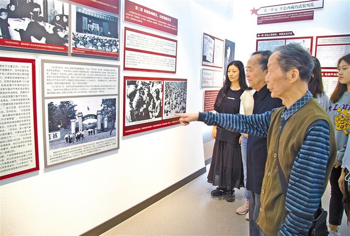 圖為展覽館內,吳逢箴教授(右一)和顧祖成教授(右二)向學生們介紹西藏民族大學校史。同東放 攝