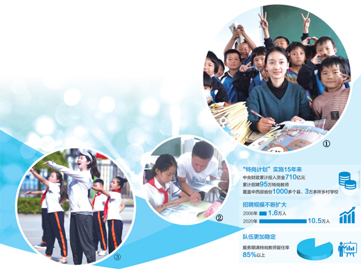 農(nóng)村義務(wù)教育階段學校教師特設(shè)崗位計劃(簡稱“特崗計劃”)始于2006年,每年公開招考選聘數(shù)萬名高校畢業(yè)生到中西部貧困縣農(nóng)村學校任教。
