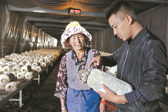 日前,記者來(lái)到林周縣大學(xué)生創(chuàng)業(yè)基地種菌大棚,看到兩名年輕小伙正在教授群眾菌菇種植知識(shí)。