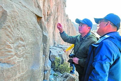 考古專家在內(nèi)蒙古桌子山巖畫群中的摩爾溝巖畫前研討。新華社發(fā)