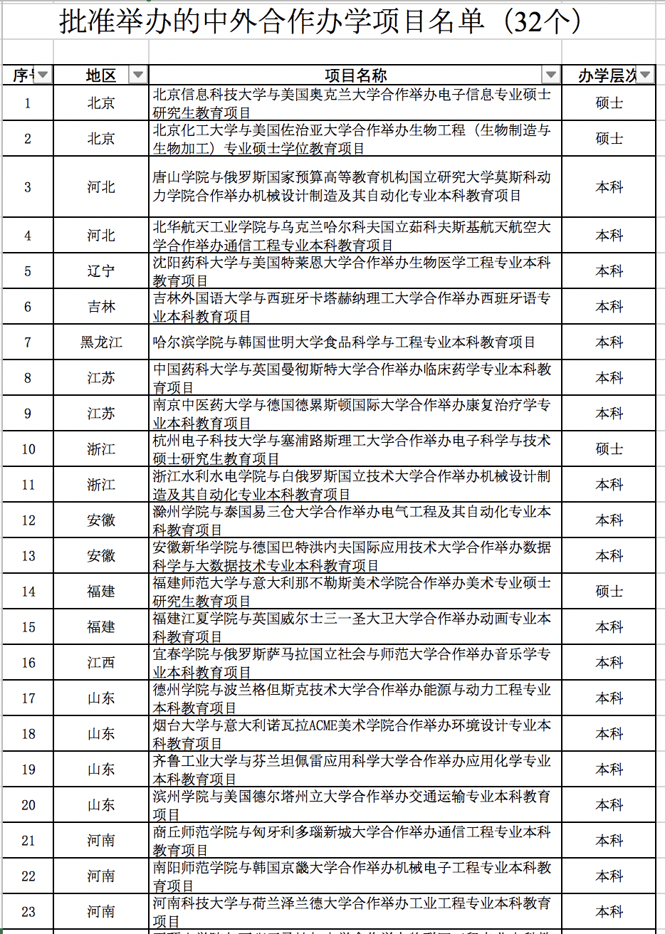 32個(gè)中外合作辦學(xué)項(xiàng)目名單如下: