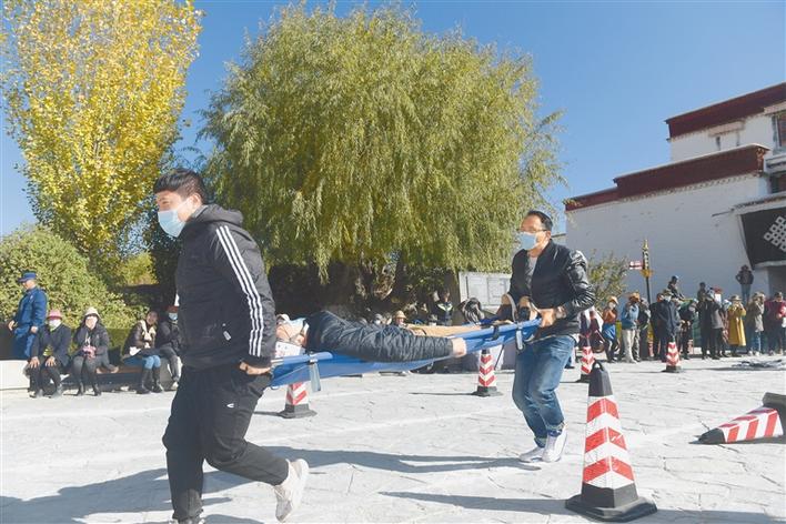 圖為11月9日,布達(dá)拉宮管理處工作人員正在進(jìn)行火場(chǎng)救援比賽。