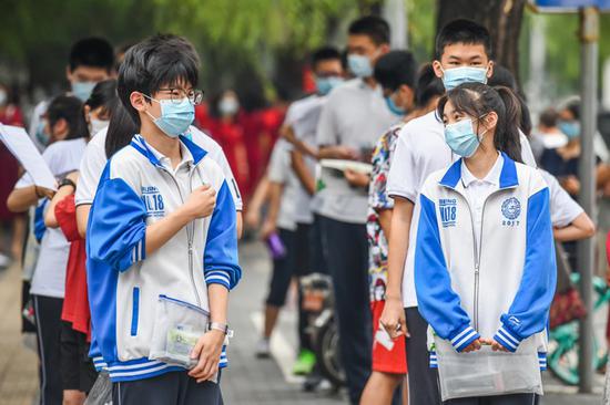 資料圖:2020年7月6日,江蘇南京一處考點(diǎn),高考考生看完考場(chǎng)后走出考點(diǎn)。 中新社記者 泱波 攝