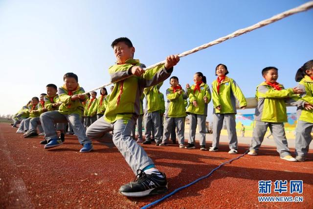 11月12日,學(xué)生在大課間參加拔河比賽。 位于山東省青島市即墨區(qū)的青島藍(lán)谷高新區(qū)東皋埠小學(xué)是一所鄉(xiāng)村學(xué)校,近年來(lái),學(xué)校開(kāi)展以乒乓球、籃球、跳繩等運(yùn)動(dòng)為主的大課間活動(dòng),讓孩子們?cè)谙硎苓\(yùn)動(dòng)的同時(shí)愉悅身心,增強(qiáng)體質(zhì)。 新華社發(fā)(梁孝鵬攝)