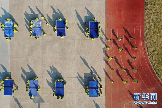 11月12日,學(xué)生在大課間打乒乓球(無(wú)人機(jī)照片)。 位于山東省青島市即墨區(qū)的青島藍(lán)谷高新區(qū)東皋埠小學(xué)是一所鄉(xiāng)村學(xué)校,近年來(lái),學(xué)校開(kāi)展以乒乓球、籃球、跳繩等運(yùn)動(dòng)為主的大課間活動(dòng),讓孩子們?cè)谙硎苓\(yùn)動(dòng)的同時(shí)愉悅身心,增強(qiáng)體質(zhì)。 新華社發(fā)(梁孝鵬攝)