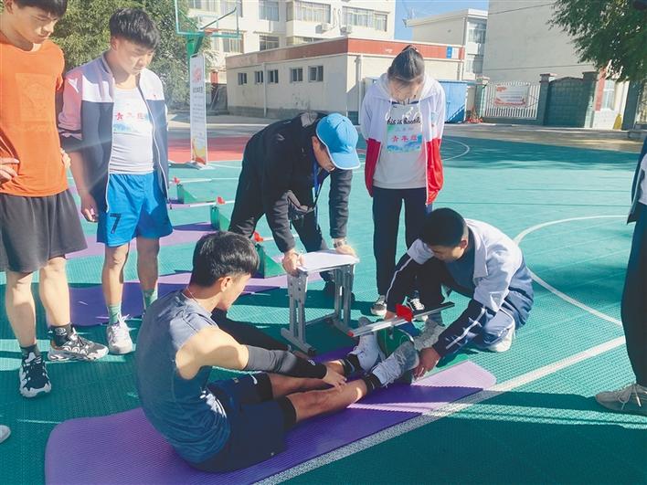 “全民健身·活力中國”國家體育鍛煉標準達標測驗賽日喀則站活動中,學(xué)生在進行坐位體前屈測試。記者 潘璐 攝