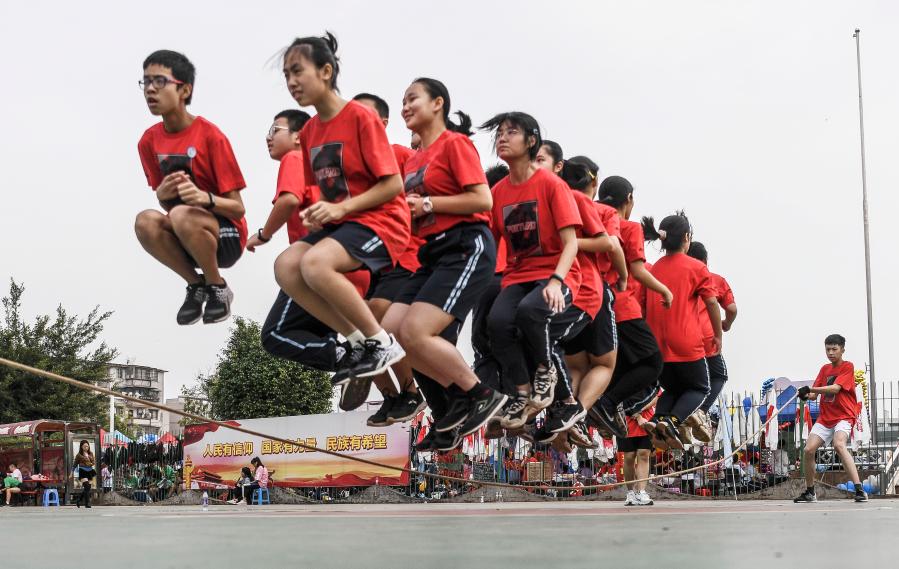 11月26日, 廣西大學附屬中學初中年級學生在集體跳繩比賽中。新華社記者張愛林攝