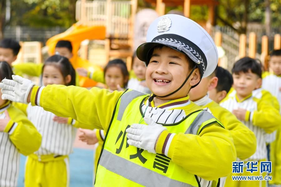 11月30日,浙江省湖州市長(zhǎng)興縣龍山幼兒園的孩子們?cè)趯W(xué)習(xí)交通指揮手勢(shì)。新華社發(fā)(譚云俸 攝)