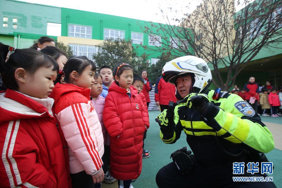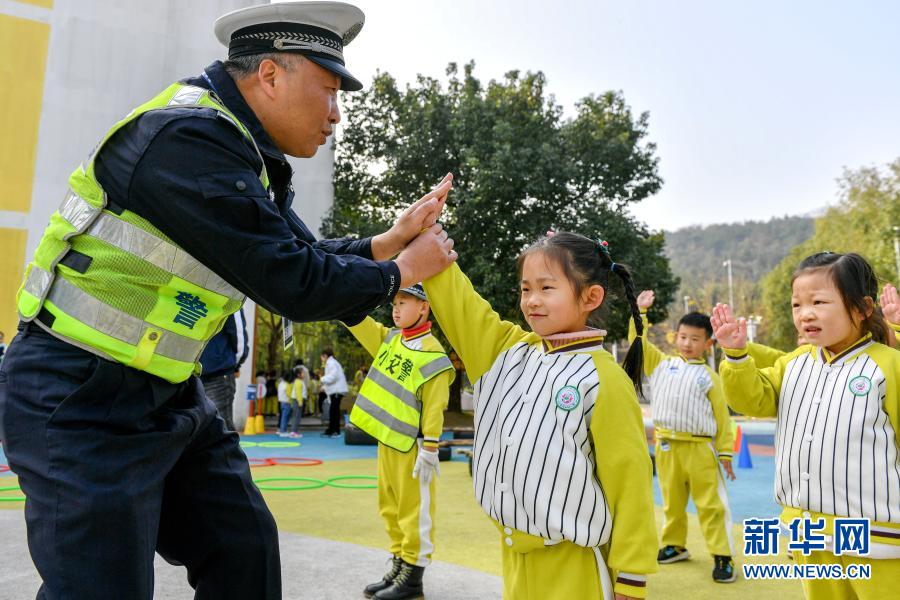 11月30日,交警在位于濟(jì)南市的山東省實(shí)驗(yàn)幼兒園南校區(qū)指導(dǎo)孩子們識(shí)別交通安全標(biāo)識(shí)牌。新華社發(fā)(郝群英 攝)