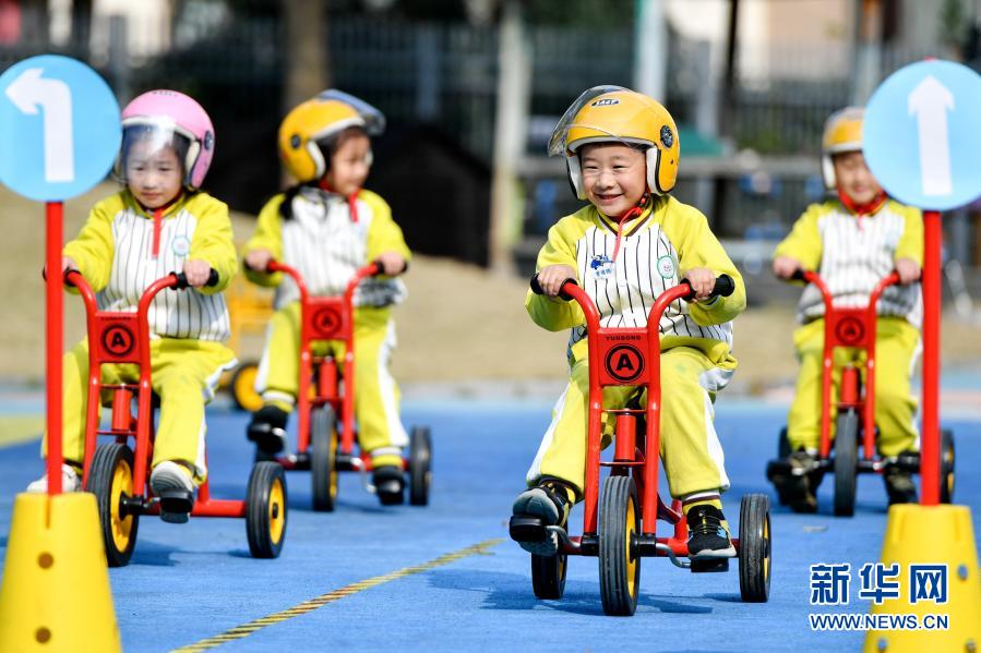 11月30日,浙江省湖州市長(zhǎng)興縣龍山幼兒園的孩子們?cè)谧觥鞍踩T行”游戲。新華社發(fā)(譚云俸 攝)