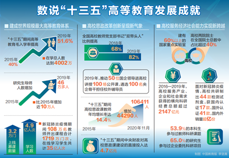 “我國已建成世界規(guī)模最大的高等教育體系?!眳菐r介紹,“十三五”期間,高等教育毛入學率不斷提升,由2015年的40%提高到2019年的51.6%,在學總人數達到4002萬。