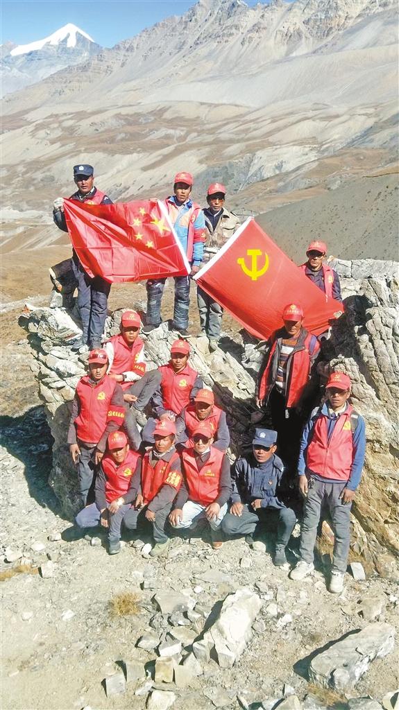 圖為吉隆縣貢當(dāng)鄉(xiāng)樟村黨員先鋒隊(duì)在通外山口巡邏過程中與國旗、黨旗合影。索朗瓊珠 次仁片多 攝