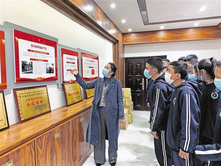 圖為拉薩阿里地區(qū)高級(jí)中學(xué)學(xué)生代表參觀黨史和學(xué)校國防教育成果展。張宇 攝