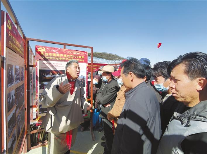圖為在桑珠孜區(qū)甲措雄鄉(xiāng)文化廣場,宣講員結(jié)合展板圖文內(nèi)容開展黨史學習教育宣講。汪純 攝