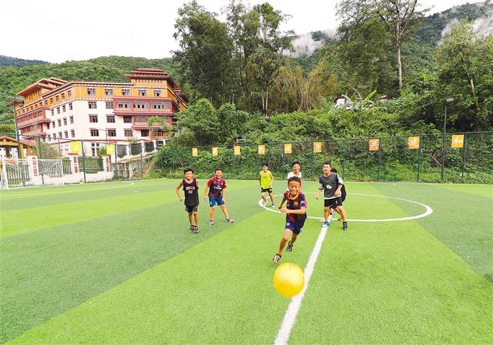 圖為林芝市墨脫縣墨脫鎮(zhèn)墨脫村的孩子們?cè)诩腋浇淖闱驁?chǎng)上踢足球。格桑吉美