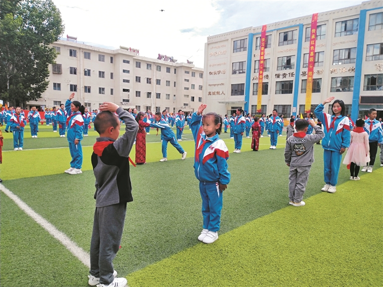 圖為老少先隊(duì)員和新少先隊(duì)員互敬隊(duì)禮。 拉薩融媒記者 莫瑞英攝