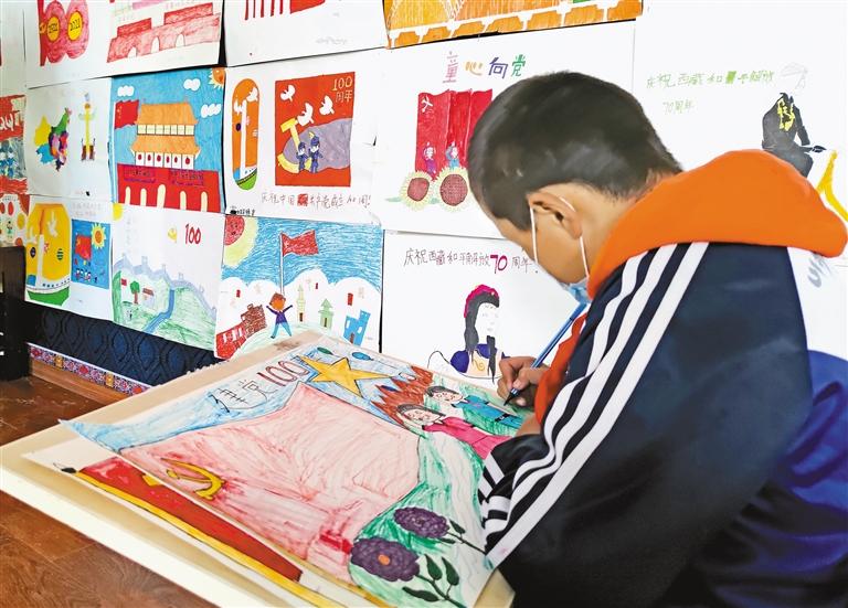 在白朗縣嘎東鎮(zhèn)中心小學(xué)少年宮,繪畫愛好者創(chuàng)作“慶祝建黨100周年”主題畫。記者 汪純 攝