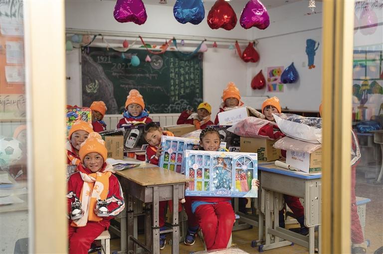 足球、籃球、奧特曼玩具、芭比娃娃、遙控飛機(jī)、自行車……孩子們欣喜地接過(guò)心心念念的禮物,迫不及待地玩耍起來(lái),紅彤彤的臉上流露出純真的笑容。
