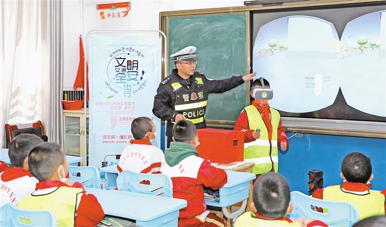 圖為林芝市公安局交警支隊民警通過VR眼鏡,讓學生更直觀地感受交通場景,提高交通安全意識。記者 彭琦 通訊員 惠盼宏 攝