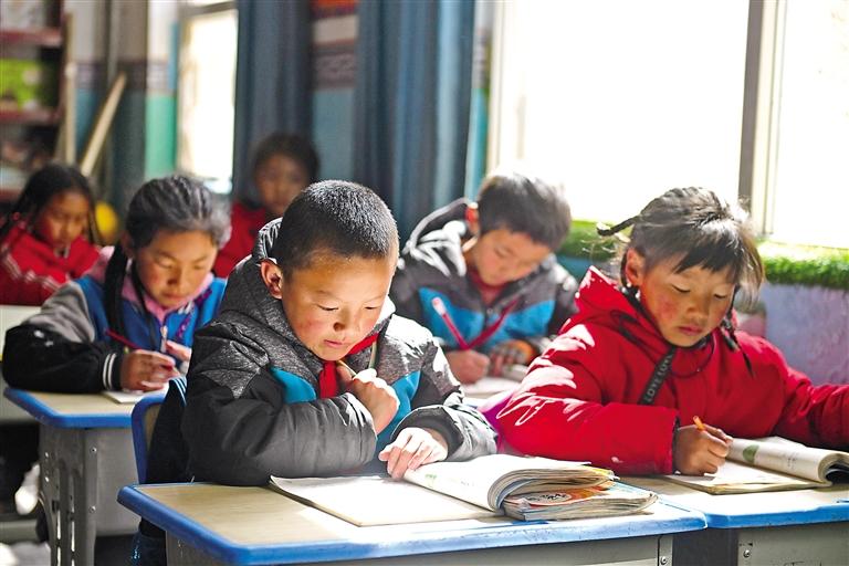 青海省玉樹(shù)藏族自治州曲麻萊縣巴干鄉(xiāng)寄宿制小學(xué)的學(xué)生在課堂上學(xué)習(xí)(4月22日攝)。新華社記者 張龍 攝