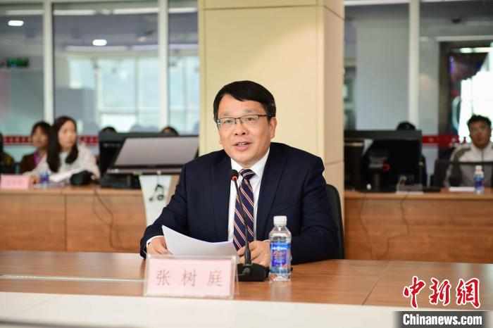圖為西藏民族大學(xué)黨委常委、副校長,中國傳媒大學(xué)黨委常委、副校長張樹庭在簽約儀式上講話。 貢嘎來松 攝