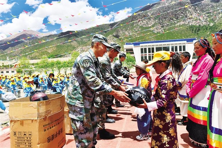 官兵代表向學生們捐贈禮品。