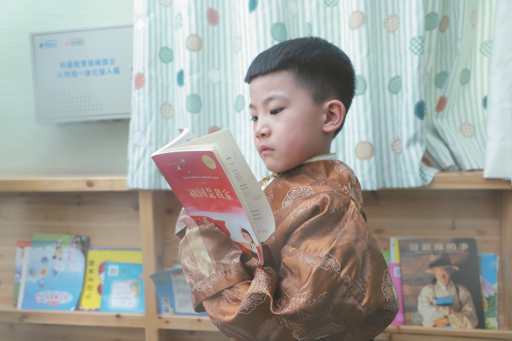 圖書館里,來自拉薩市江蘇實(shí)驗(yàn)幼兒園大五班的小朋友益西加措仔細(xì)地挑選著自己喜歡的書籍,只見他饒有興致地選中這本《祖國是我家》,并發(fā)現(xiàn)了書中“我在南京,我為中華之崛起而讀書”的卡片時,他回應(yīng)道:“我在西藏,我為中華之崛起而讀書?!?/p>