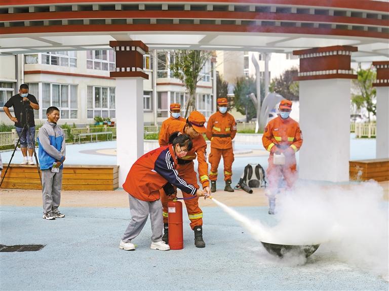 圖為消防員教學(xué)生使用滅火器。記者 張猛 王珊 謝筱純 攝