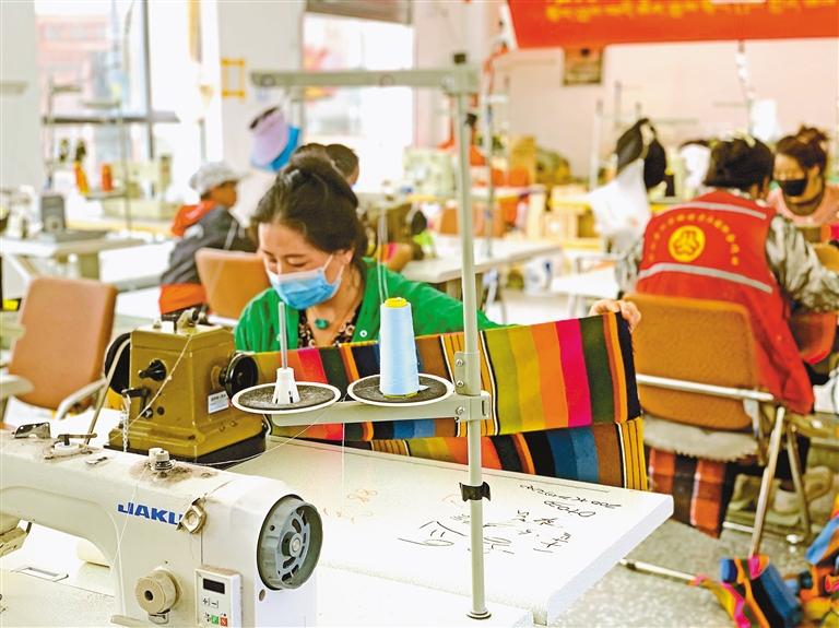 圖為就業(yè)群眾在車間里縫制藏式服裝。記者 裴聰 攝