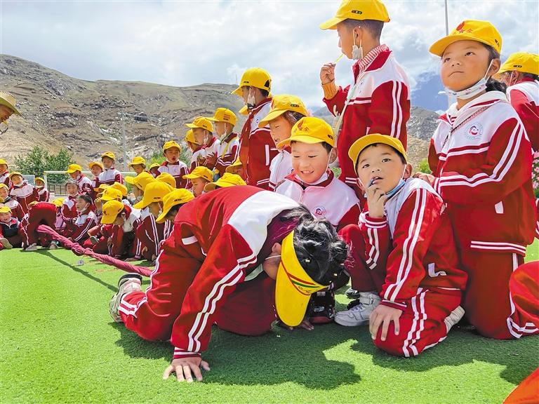 曲水縣達嘎鎮(zhèn)小學學生在體驗民族傳統(tǒng)體育項目押加。(圖片由區(qū)社體中心提供)