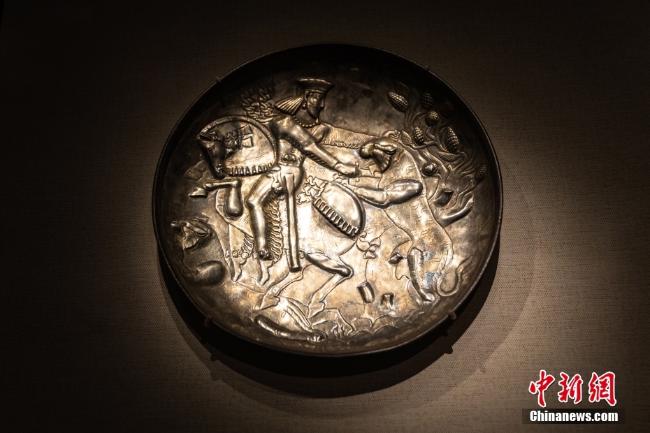 8月18日,甘肅省敦煌市,“燦爛記憶:從美索不達(dá)米亞到犍陀羅——東方文明古國冶金術(shù)展”在敦煌莫高窟揭幕。此次展覽是敦煌研究院與日本平山郁夫絲綢之路美術(shù)館近年第三次合作,展覽共展出從地中海沿岸,到中亞絲綢之路沿線國家的金屬類文物221組件、絲路錢幣33枚,時間跨度長達(dá)4000多年、范圍遍及歐亞大陸的絲綢之路上各大文明區(qū)域冶金術(shù)的變化圖景。圖為參展展品帝王狩獵紋盤。 中新社發(fā) 王嘉奇 攝