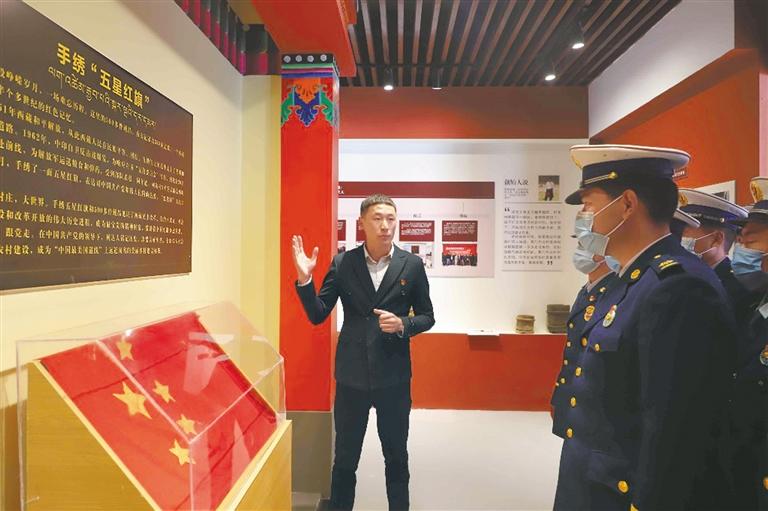 圖為消防救援人員聆聽基地工作人員講解展品——手繡“五星紅旗”的故事。記者 桑鄧旺姆 通訊員 姚響 張洪 攝