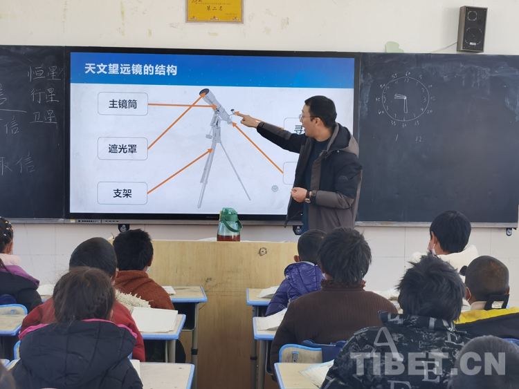 11月30日,王建煜受邀來到海拔4300多米的騾子溝小學,帶著天文設(shè)備為牧區(qū)孩子們上了一節(jié)望遠鏡觀測入門課。王建煜通過PPT展示了豐富的天文社團活動,引起了孩子們強烈的好奇心和探索心。他介紹到,要想觀測到遙遠的地方,必須要借助工具,而天文望遠鏡,就是我們觀測星空的工具。