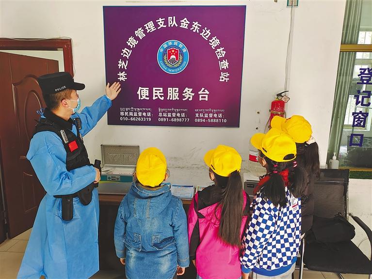圖為金東邊境檢查站民警為學(xué)生介紹便民服務(wù)臺(tái)用途。記者 張猛 通訊員 揚(yáng)子 攝