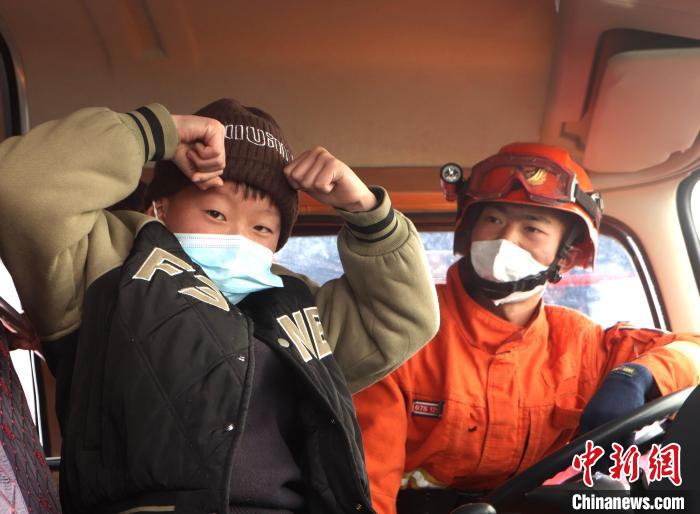 森林消防隊(duì)員組織小朋友體驗(yàn)消防車(chē)?!×种ナ猩窒拦﹫D