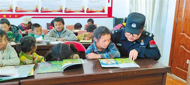 日喀則市曲龍貢達村駐村工作隊(西藏邊檢總站派駐)開設小課堂,為中小學生免費提供制作手工、課外讀物講解等服務。圖為駐村隊員劉海鵬為學生講解課外讀物。記者 盧文靜 攝