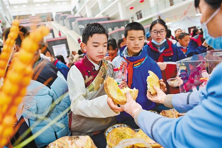圖為2月21日,在西安市浐灞第一中學(xué)舉行的藏歷新年團(tuán)拜活動(dòng)上,漢藏學(xué)生品嘗特色小吃。新華社記者 李一博 攝