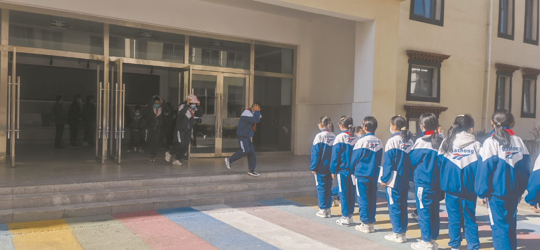 活動中,拉薩市第八中學師生進行了地震應急疏散演練。當警報聲響起,學生們在老師的指揮下,借助課桌緊急避險,并按照自護、自救方法,彎腰、護頭沿著指定疏散路線快速跑出教室,來到空曠的指定疏散地點。整個演練緊張有序,達到了預期目的。