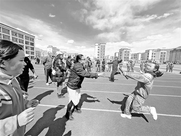 圖為學(xué)生及家長(zhǎng)參加接力比賽。記者央金 攝