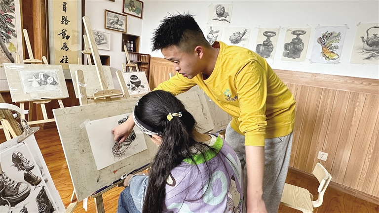 “‘西瓜老師’,這個面包是我特意帶給你的,你餓的時候一定吃?!薄啊鞴侠蠋煛憧次医裉飚嫷迷趺礃??有沒有進步?”“‘西瓜老師’,這個地方我不會畫,你能不能教教我?”……課余時間里,陳寶佳經(jīng)常和孩子們一起玩耍,慢慢就成為了孩子們的好朋友。陳寶佳說:“雖然平時會和他們在一起說說笑笑,但是上課的時候我還是比較嚴(yán)厲的。我主要帶素描課,要引導(dǎo)孩子們打好繪畫基礎(chǔ)、練好基本功,今后他們才能在繪畫方面有更多的發(fā)展??吹胶⒆觽儺嫯嬘羞M步的時候,我會覺得很幸福?!?/p>