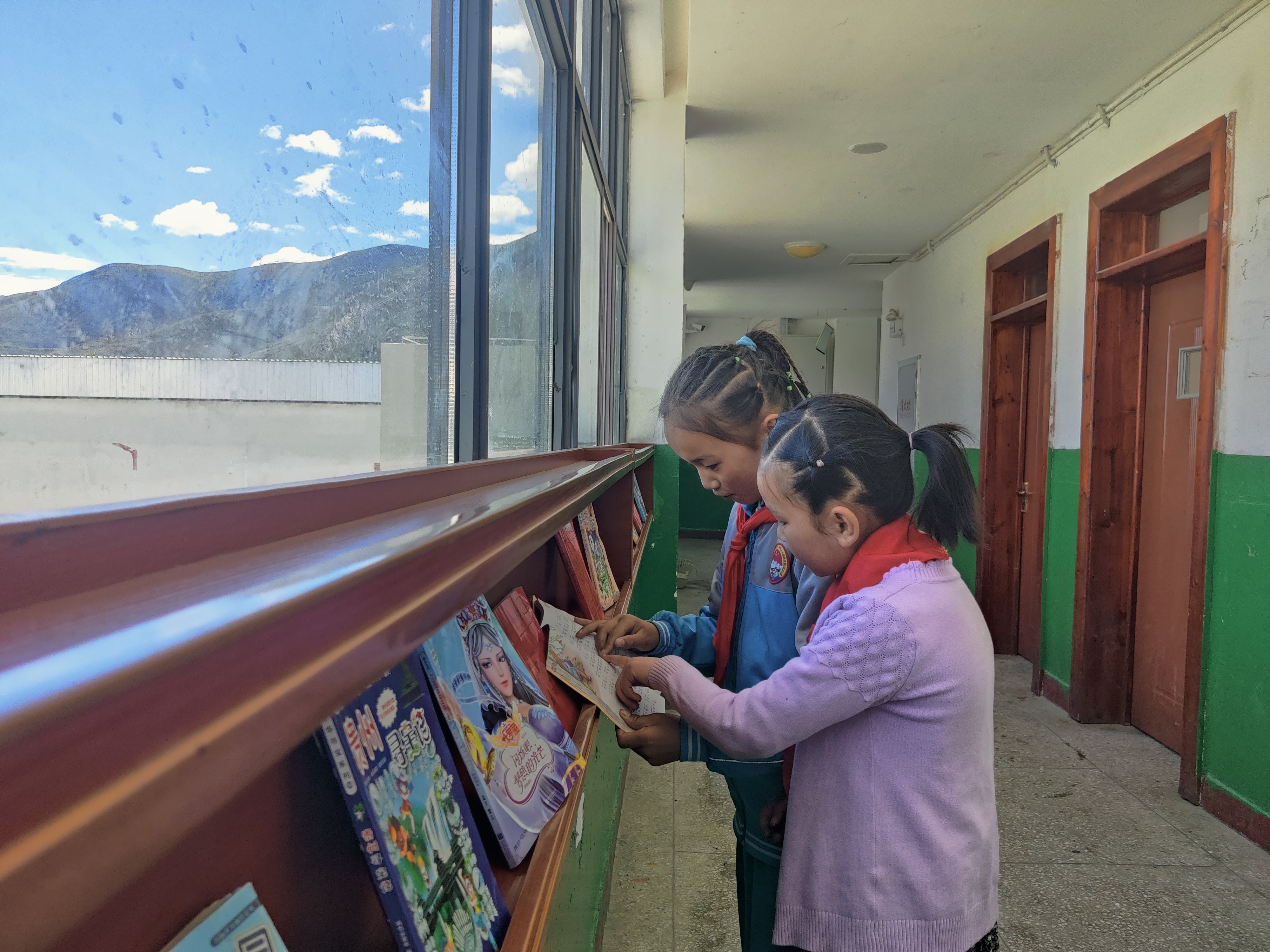 圖為買玉軒(右一)和同學(xué)在讀書廊看課外書。拉薩融媒記者 余洋洋攝